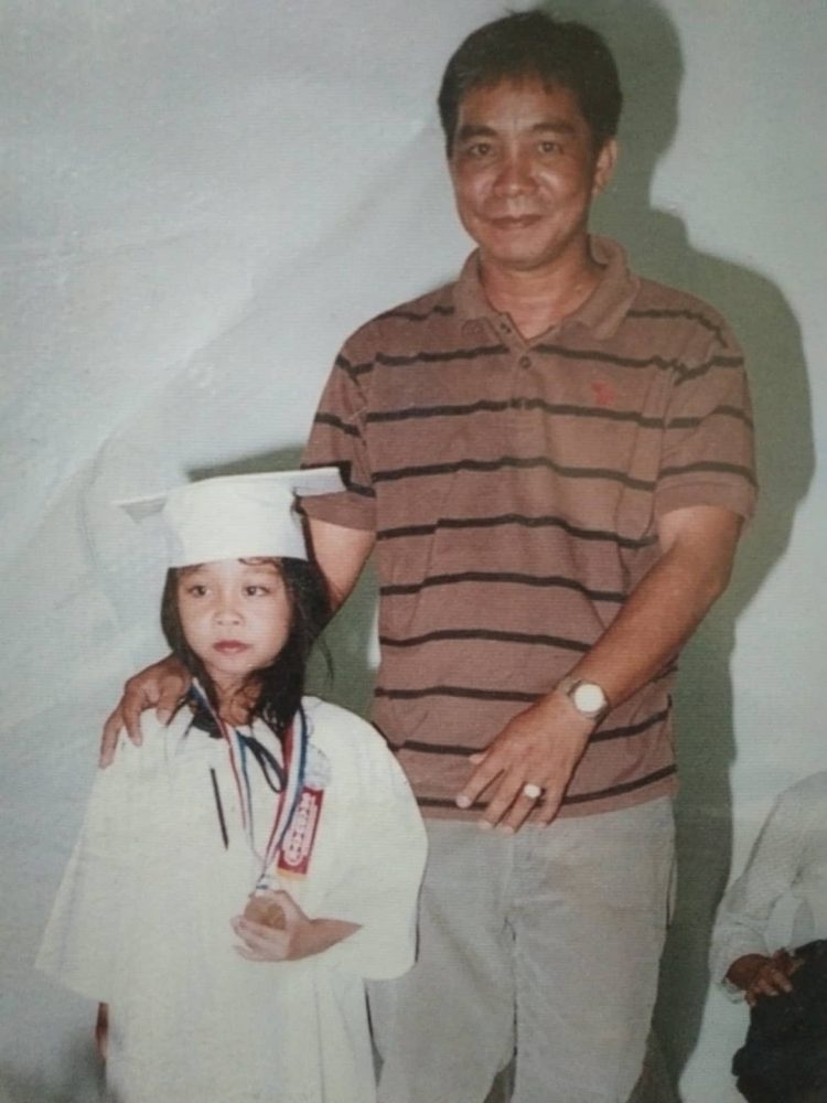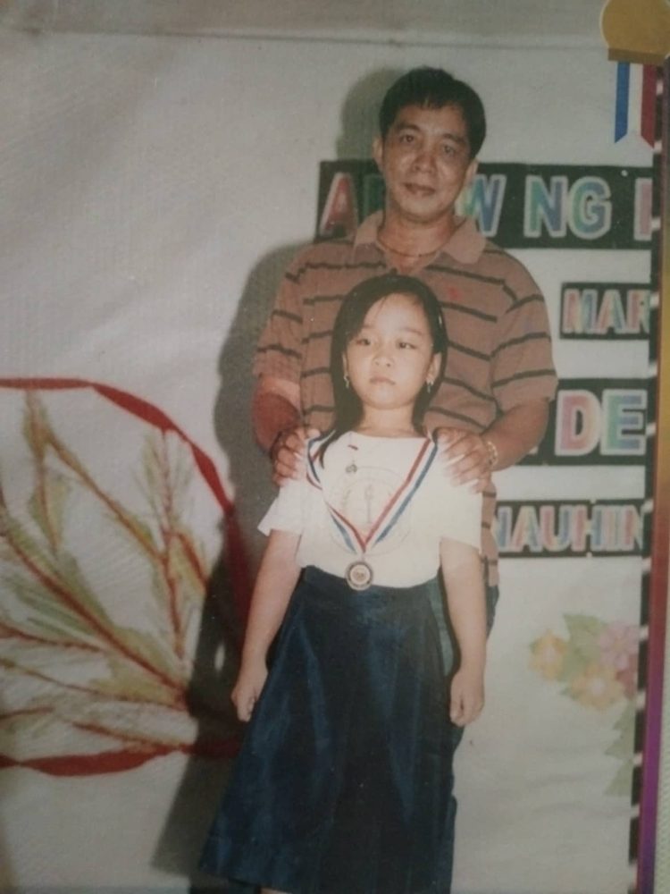 This photo was taken ten years ago. You wanna know why my mom cut my hair like this? It is because I love Dora so much. I always watched Dora the Explorer when I was young. There’s a story behind this photo, Me and my Ate Bita (daughter of my nanny) escaped from the house without the permission of my nanny because she want me to have a picture in a studio, after that we went home and my nanny is very angry.This photo was taken when years ago, It is so cute picture of mine because I saw my dad’s face and base on his smile he is very happy and proud.
